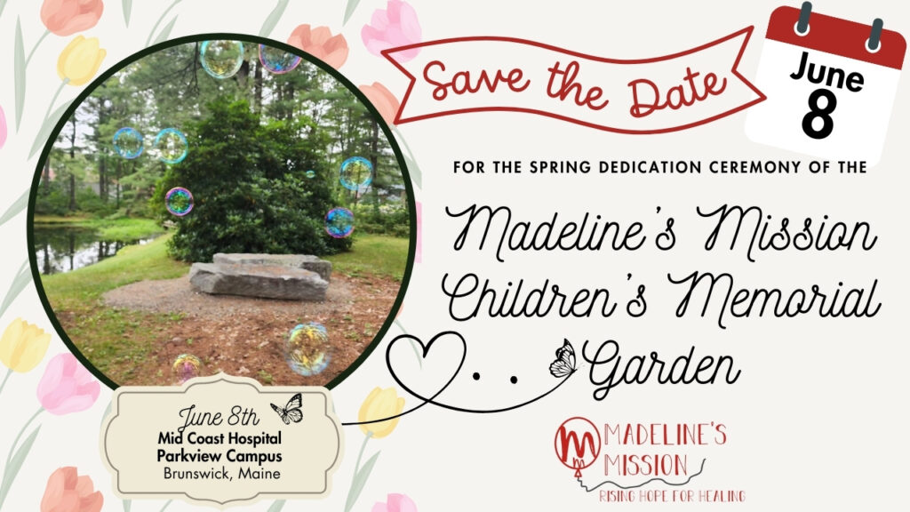 With a generous gift of space from Mid Coast-Parkview Health, Madeline’s Mission aims to create a memorial garden for families wanting to honor their child or baby that has died. Located by a beautiful little pond on the Parkview campus of Mid Coast Hospital in Brunswick, Maine, the Madeline’s Mission Memorial Garden will provide a space for families to remember and honor their child with a butterfly sculpture in their honor. The Madeline’s Mission Children’s Memorial Garden will create a serene space for reflection and healing.